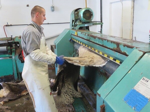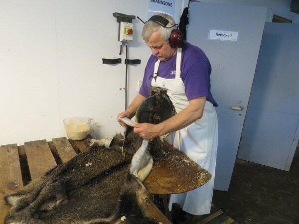 Sesongens siste leigeberedningsskinn av elg, hjort, rådyr, lama, villsvin og moskus No gjekk sesongens siste elg-, hjort-, rådyr-, lama-, villsvin- og moskusskinn frå privatkundar i arbeid. Me må ha ei viss mengde skinn for å fylle ei valke. Nå var kvoten nådd. Våt prosessane på slike skinn tar ca. 3 veker. Etterpå skal dei feittast og tørkast. Til slutt blir dei strekt, slipt og ferdigstilt. Me reknar med at disse skinn blir utsendte i slutten av september. Stefan brukar kreismesseren og Kamil brukar skjæremaskina.
