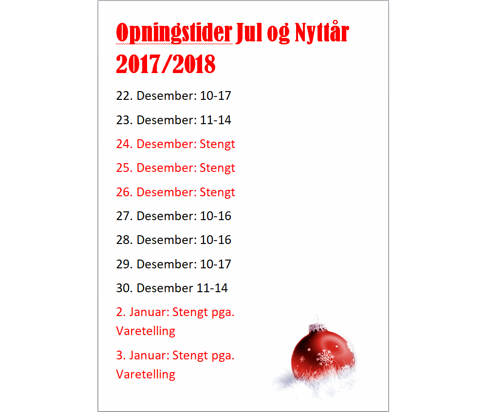 Opningstider Jul og Nyttår 2017 / 2018 Nå har me pynta til jul i fabrikkutsalget vårt. Her kan du finne fine julegåver i fleire prisklasser.Me har tilbud på villsau- og kvite spælsauskinn. Tilbudet gjeld for privatkunder som besøker fabrikkutsalget. Velkommen innom!