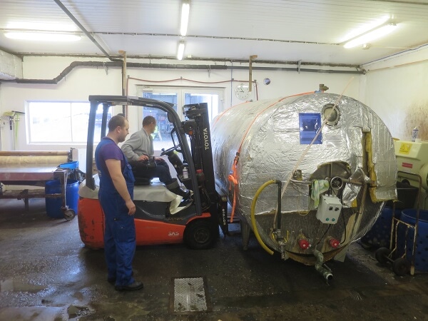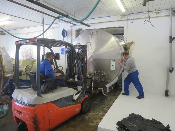Varmtvatns-tanken frå 1980 går ut av historia. Varmtvatns-tanken frå 1980 går ut av historia. Den blei kjøpt brukt på eit vaskeri på austlandet, men sjølv rustfritt stål slår sprekker. Nå blei lekkasjane for store. Ny tank smyg akkurat gjennom døropninga og vil gi oss auka kapasitet på varmtvatnet. Håpar den også får eit langt varmt liv.