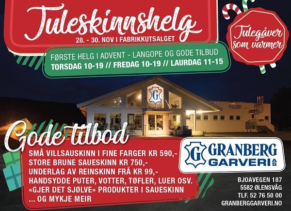 Juleskinnshelg Det nærmar seg Advent og me har utvida opningstid førstkomande torsdag, fredag og laurdag med ekstra gode tilbod. Servering av gløgg og julegodt. Velkommen innom!