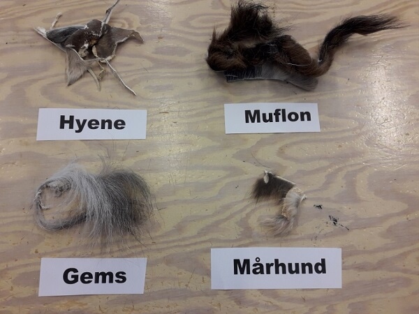 Ulv, hare, antilope, hund, jerv, puma, oter, mår/mårhale, gaupe, bjørn, grevling, villsvin, ullgris, moskus, mårhund, hyene, gems og muflon alt til ein pris av: 100 gram kr 200 .