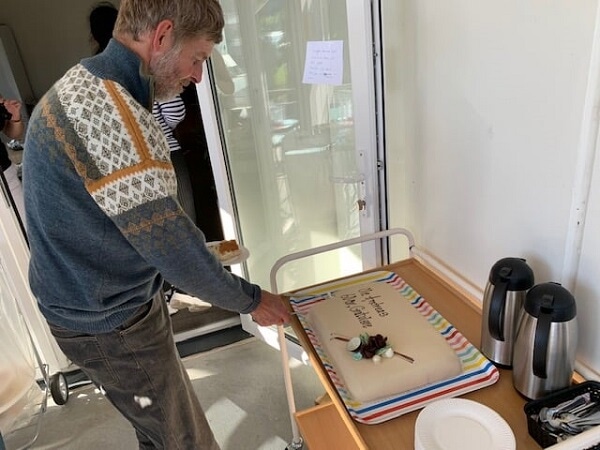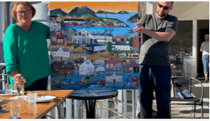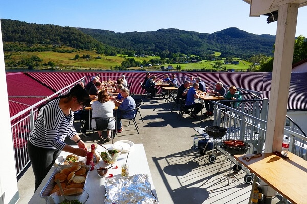 Grilling og noko attåt Normalt pleier me ha ein grillettermiddag på terrassen kvar sommar. I fjor stoppa koronaen dette, men torsdag fekk me det til i 20 graders ettermiddagssol. Bedrifta er 70 år i år, men markering av det er, av koronaårsaker, utsett til neste år. I høve jubileet hadde me bestilt eit måleri av Gudrun Røyneberg. Sidan Gudrun var på hytta si her enda, overleverte ho måleriet og gav grundig forklaring på alle detaljar. Måleriet er ei historieforteljing om bedrifta og familien bak bedrifta. Stor takk til kunstnaren Gudrun for vel uttenkt og gjennomført oppdrag! Elles markerte me Ole Andreas sin 60 års dag. Litt besøk av veps hadde me også, men ingen blei stukken.