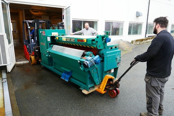 Ny stollemaskin Nye maskiner treng me heile tida. Denne kom frå Spania sist veke og nå skal den på plass og i bruk. Det er ei stollemaskin (maskin som stekker ut og mjukar opp hudsida på skinna). Med denne maskina i drift vil kapasiteten vår auka.