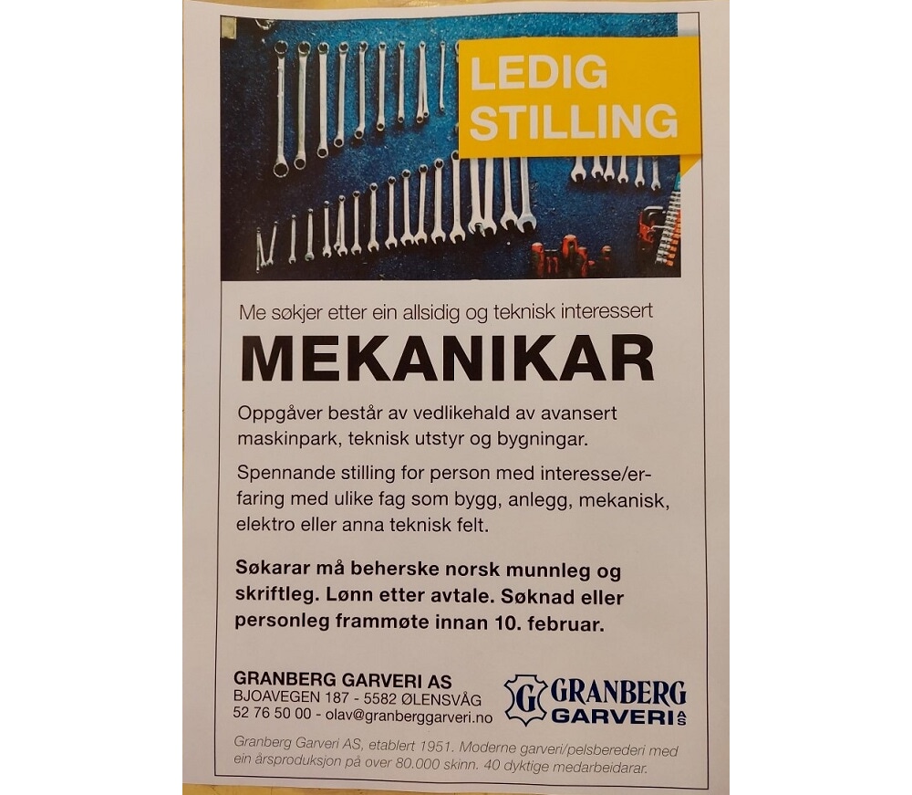 Mekanikar Her er mange oppgåver med maskiner og bygg, me søker difor no etter ein med ledige hender, som er teknisk interessert.