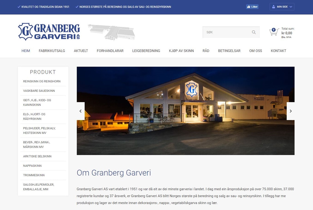 Nye nettsider Granberg Garveri har no lansert nye nettsider med nettbutikk for forhandlarar. Dei er brukarvennlege både på mobil, iPad og liknande media. Løysinga er levert av Unimicro og spesialtilpassa vår bruk. Dei er vår samarbeidspartnar både på rekneskap, faktura, løn, ordrebehandling, kunde/vareoppfølging og dokumenthandtering. Nettsida gir nyttig informasjon om oss og våre produkt. Nettbutikken er kopla opp mot vår kunde-/varedatabase der bestillingar frå våre forhandlarar vert automatisk oppdatert. Dette gir oss mindre administrativt arbeid og forhandlarane får betre oversikt. Ta deg "ein runde" ....