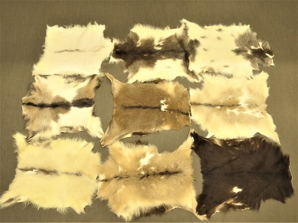 Skinna er ca. 60-70 cm lange. Fargane er assorterte, bilde viser eit representativ utvalg av fargar. Fargar og mønster varierer frå skinn til skinn. Skinna har nokre snauflekker (hårlause plasser) i pelsen. Skinna er fullt brukbare til dekorasjonskinn (sjå foto), gaver til barn, til dokkevogn eller til å sy noko av (hodeplagg, småartiklar o.l.).