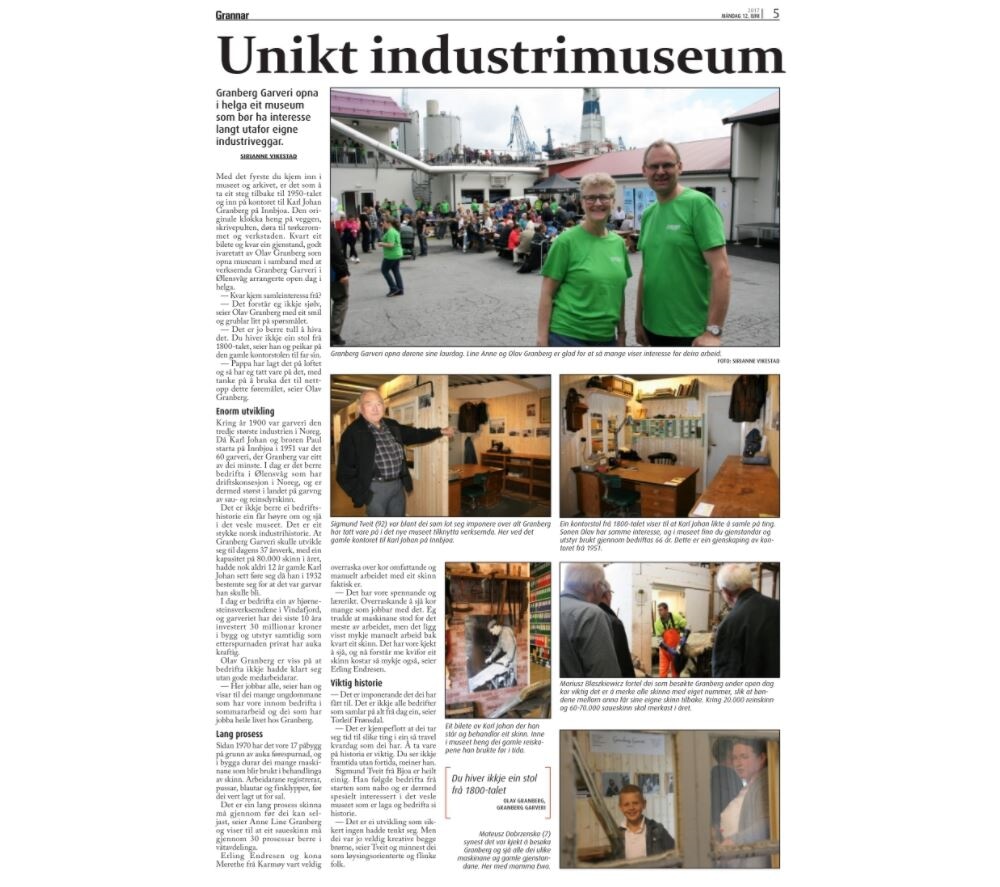 Det er ikkje berre ei bedriftshistorie ein får høyre om og sjå i det vesle museet. Det er eit stykke norsk industrihistorie. At Granberg Garveri skulle utvikle seg til dagens 37 årsverk, med ein kapasitet på 80.000 skinn i året, hadde nok aldri 12 år gamle Karl Johan sett føre seg då han i 1932 bestemte seg for at det var garvar han skulle bli.