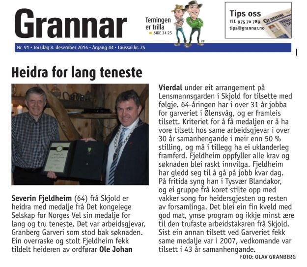 Severin Fjeldheim frå Skjold er heidra med medalje frå Det kongelege Selskap for Norges Vel med medalje for lang og tru teneste.
