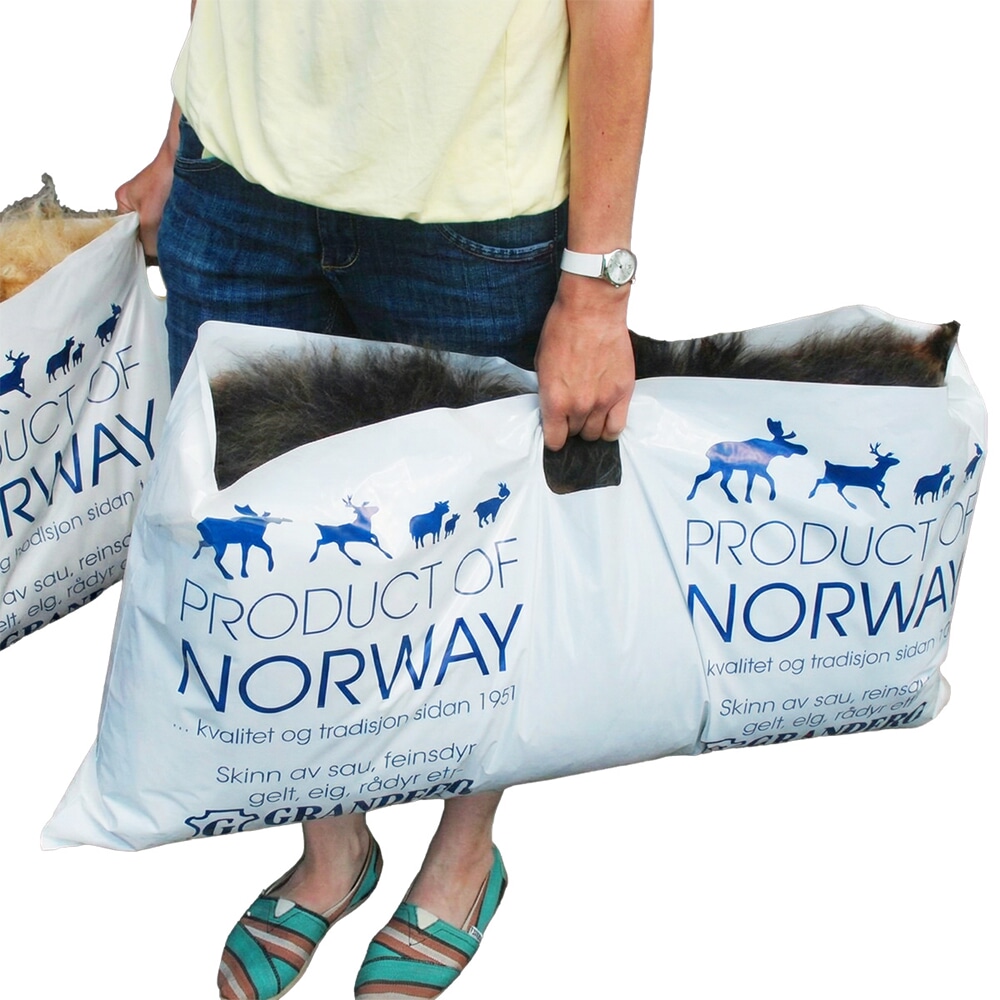 Praktisk spesiallaga pose for saueskinn og reinskinn. Posen er tilpassa eit reinskinn eller to saueskinn. Posen vil letta arbeidet med emballering og vera ein stor fordel for kunden ved for eksempel taxfree handel.